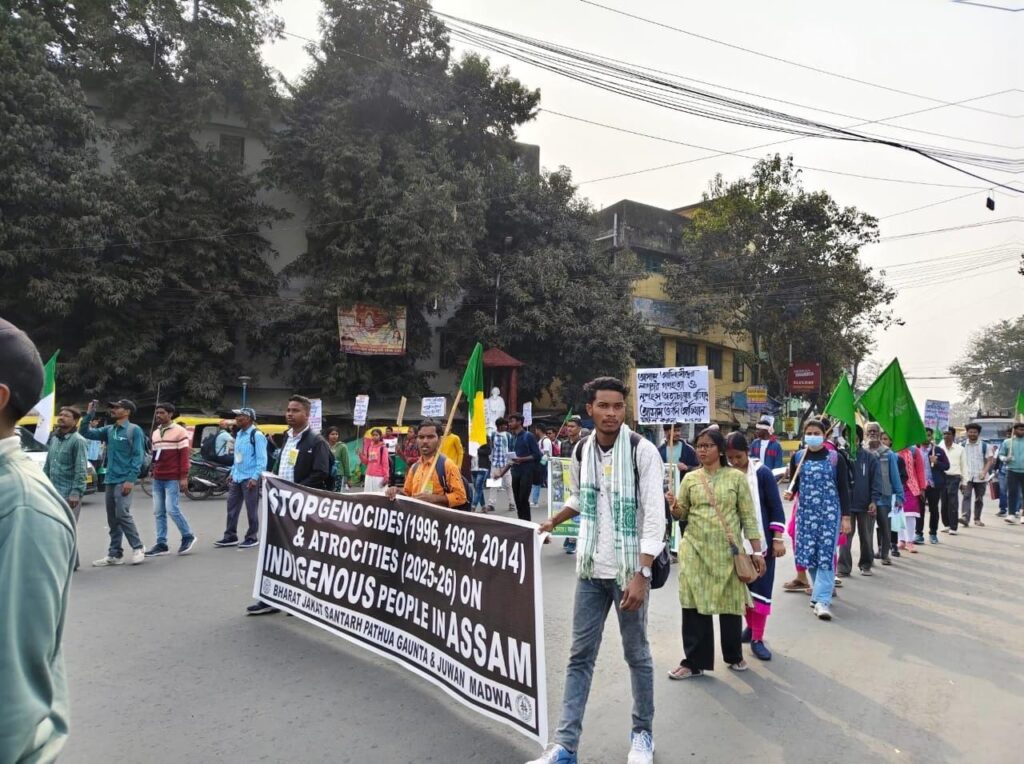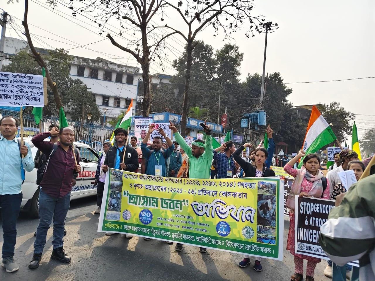 আসামে আদিবাসী জনগণের উপর দীর্ঘদিন ধরে চলা নৃশংস অত্যাচার, উচ্ছেদ ও অগ্নিসংযোগের প্রতিবাদে শুক্রবার কলকাতায় আসাম ভবন অভিযান সংগঠিত হল। বেলেঘাটা সিআইটি মোড় থেকে শুরু হয়ে এই মিছিলটি পরিবেশ ভবন পেরিয়ে আসাম ভবনের সামনে গিয়ে শেষ হয়। অভিযান চলাকালীন আসামের মুখ্যমন্ত্রীর কুশপুতুল দাহ করা হয়। আন্দোলনকারীদের অভিযোগ, ১৯৯৬, ১৯৯৮ ও ২০১৪ সাল থেকে ধারাবাহিকভাবে আসামের আদিবাসীরা হামলা, গণহত্যা ও ঘরবাড়ি পুড়িয়ে দেওয়ার শিকার হয়ে আসছেন। সাম্প্রতিক সময়ে, ১৯ ও ২০ জানুয়ারি ২০২৬ তারিখে কোকরাঝাড় জেলার কারিগাঁও গ্রামে পুলিশি সহায়তায় ২৯টি আদিবাসী পরিবারের বাড়িঘর পুড়িয়ে দেওয়া হয়। যার ফলে শতাধিক মানুষ গৃহহীন হয়ে ত্রাণশিবিরে আশ্রয় নিতে বাধ্য হন।