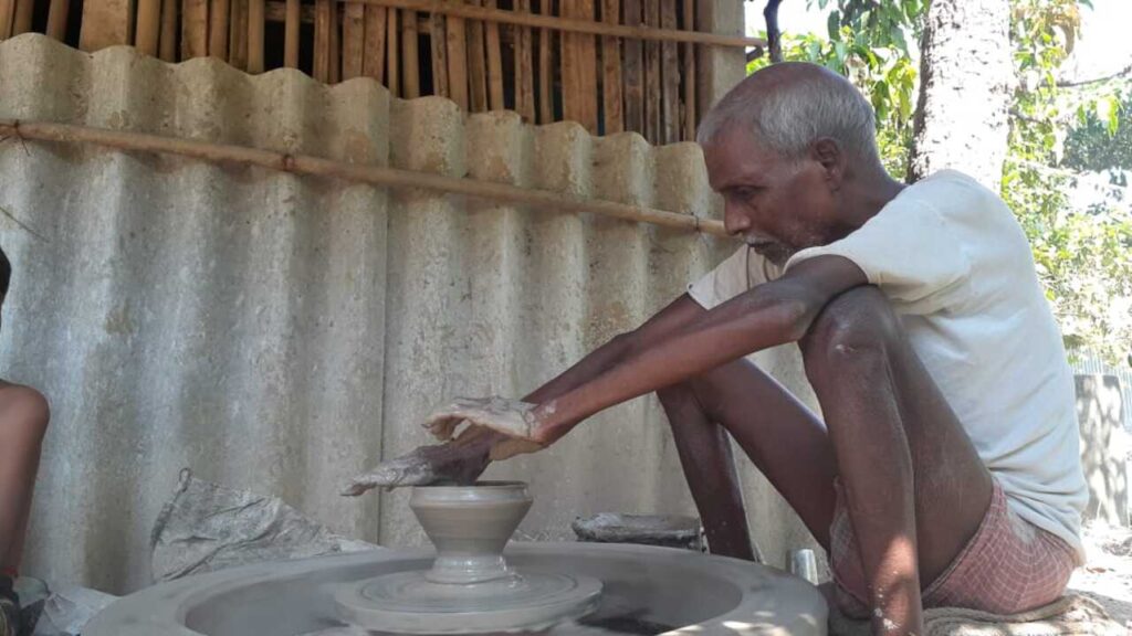 পুরুলিয়ার কাশীপুরের নপাড়া গ্রামের কুম্ভকারপাড়া এখন যেন এক কর্মচঞ্চল শিল্পশালা। সকাল থেকে সন্ধ্যা পর্যন্ত চাকার ঘূর্ণিতে নরম মাটি নিচ্ছে নানা আকার। রঞ্জিত কুম্ভকার, শ্রীমতি কুম্ভকার— এমন অনেক শিল্পীর ঘরে ঘরে তৈরি হচ্ছে ধুনুচি। কেউ মাটি কেটে আনছেন পুকুরের ধার থেকে, কেউবা চাকার পাশে বসে নিখুঁত আকার দিতে ব্যস্ত। এক হাতে মাটির ভর, অন্য হাতে ছুরি, আর চোখে অদ্ভুত মনোযোগ— এমন দৃশ্যেই ভরে উঠেছে কুম্ভকারপাড়া।